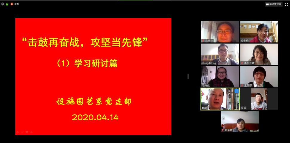 4月14日,設施園藝系黨支部利用zoom會議軟件線上開展了“擊鼓再奮戰(zhàn)、攻堅當先鋒”學習研討活動,支部全體黨員參加。