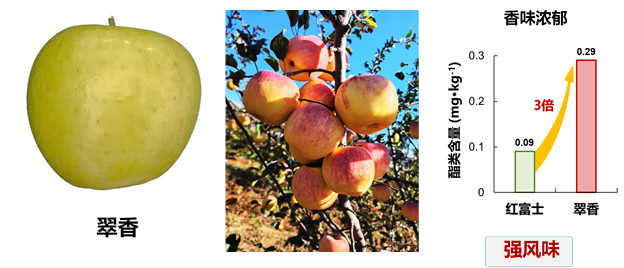 (三)針對我國蘋果主栽品種同質(zhì)化嚴重的問題,利用挖掘的香氣濃郁的‘紅玉’、晚熟耐貯的‘長富2’骨干種質(zhì),育成了果皮綠色(套袋解袋后粉紅色)、香味濃郁、晚熟耐貯、早果豐產(chǎn)宜機好管的‘翠香’。