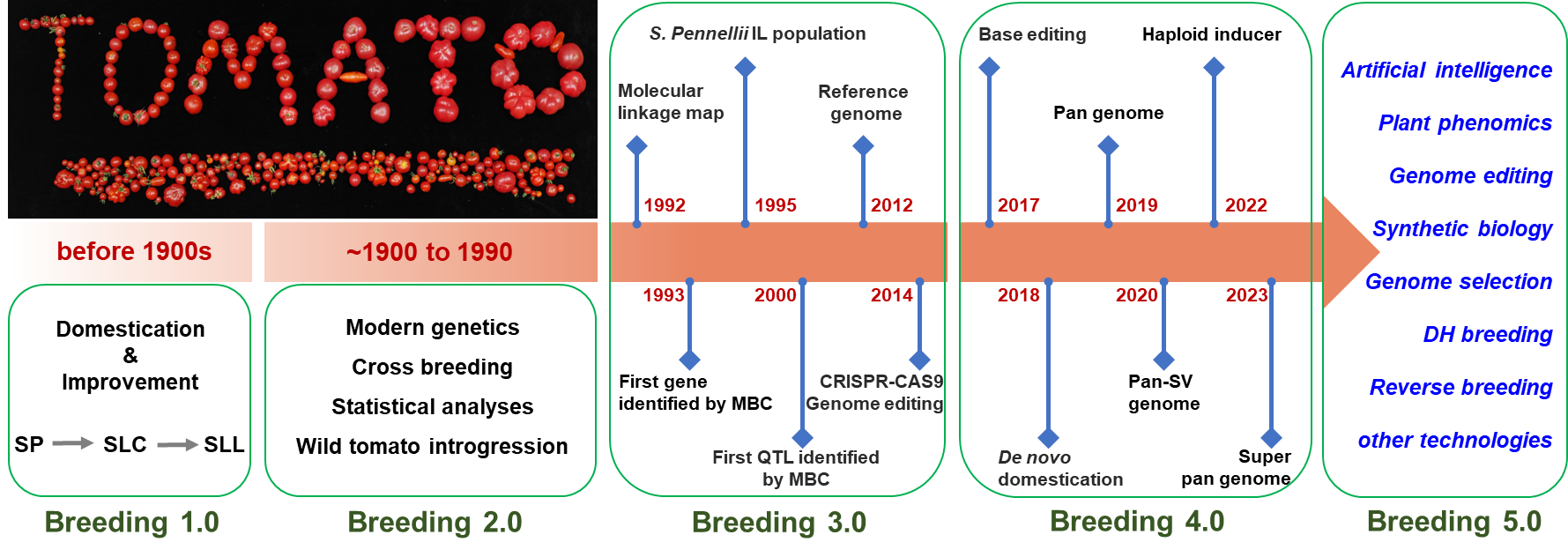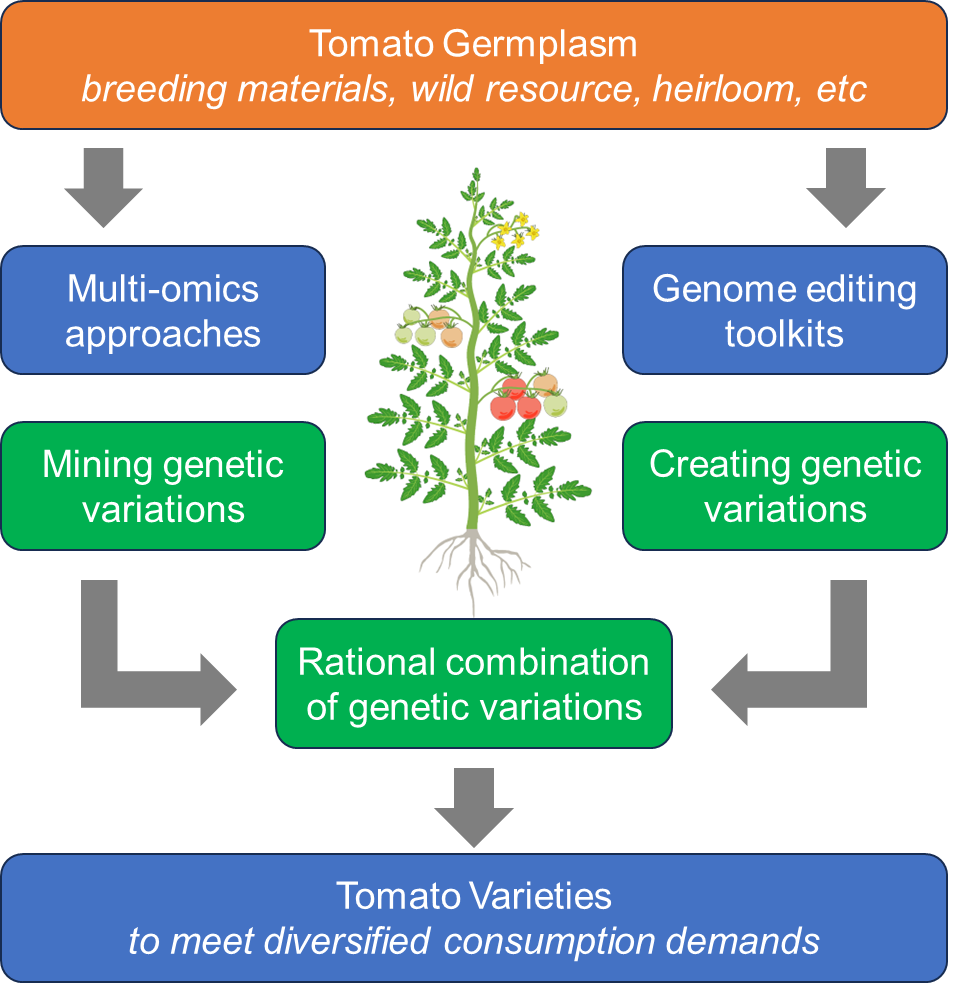 番茄(Solanum lycopersicum)是世界范圍內(nèi)廣泛種植的蔬菜作物,同時(shí)也是一種重要的水果替代品。現(xiàn)代栽培番茄起源于南美洲安第斯山脈,由野生醋栗番茄馴化改良而來(lái):第一步,醋栗番茄SP馴化為過(guò)渡種SLC;第二步,由過(guò)渡種SLC改良為現(xiàn)代栽培番茄SLL。現(xiàn)代栽培番茄根據(jù)其用途可分為鮮食番茄(水果用、沙拉用或菜用)和加工番茄(番茄泥、番茄罐頭、番茄醬和番茄汁等)兩大類。目前,中國(guó)已成為世界最大的番茄生產(chǎn)和消費(fèi)國(guó),年產(chǎn)量在6700萬(wàn)噸左右。除了作為重要的果蔬作物,番茄還是人們研究遺傳學(xué)、基因組學(xué)、果實(shí)發(fā)育和植物育種的經(jīng)典模式植物。以番茄為對(duì)象,人們發(fā)現(xiàn)了第一個(gè)多肽類植物激素系統(tǒng)素(systemin);構(gòu)建了作物中第一張高密度分子連鎖圖譜;克隆了作物中第一個(gè)數(shù)量性狀位點(diǎn)Fw2.2;在植物中首次克隆了符合“基因?qū)颉奔僬f(shuō)的抗病基因Pto以及鑒定了機(jī)械損傷誘導(dǎo)植物再生的原初信號(hào)分子REF1。過(guò)去30年,分子生物學(xué)和高通量測(cè)序技術(shù)等的飛速發(fā)展,特別是2012年番茄參考基因組測(cè)序完成和2013年CRISPR/CAS9基因編輯技術(shù)在植物中的應(yīng)用,極大推動(dòng)了番茄功能基因組學(xué)和遺傳育種方面的研究。迄今為止,人們已經(jīng)對(duì)超過(guò)300個(gè)番茄基因的功能進(jìn)行了深入的研究,其中一些基因在加速番茄性狀改良和品種培育方面發(fā)揮了重要作用。與此同時(shí),高效分子育種技術(shù)的蓬勃發(fā)展,包括基因編輯、全基因組選擇、單倍體育種及雄性不育制種等先進(jìn)技術(shù),正逐步融入番茄品種改良的實(shí)踐之中。這些技術(shù)的應(yīng)用,不僅提高了育種效率與精準(zhǔn)度,還為實(shí)現(xiàn)番茄作物的遺傳改良與產(chǎn)量提升開(kāi)辟了新途徑。